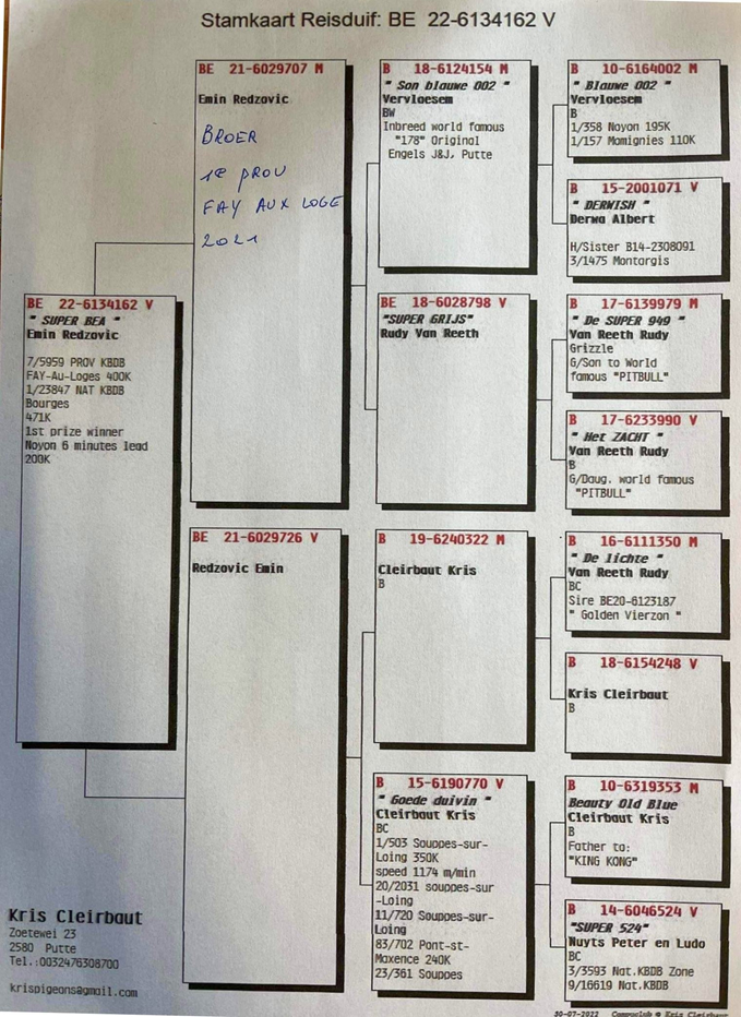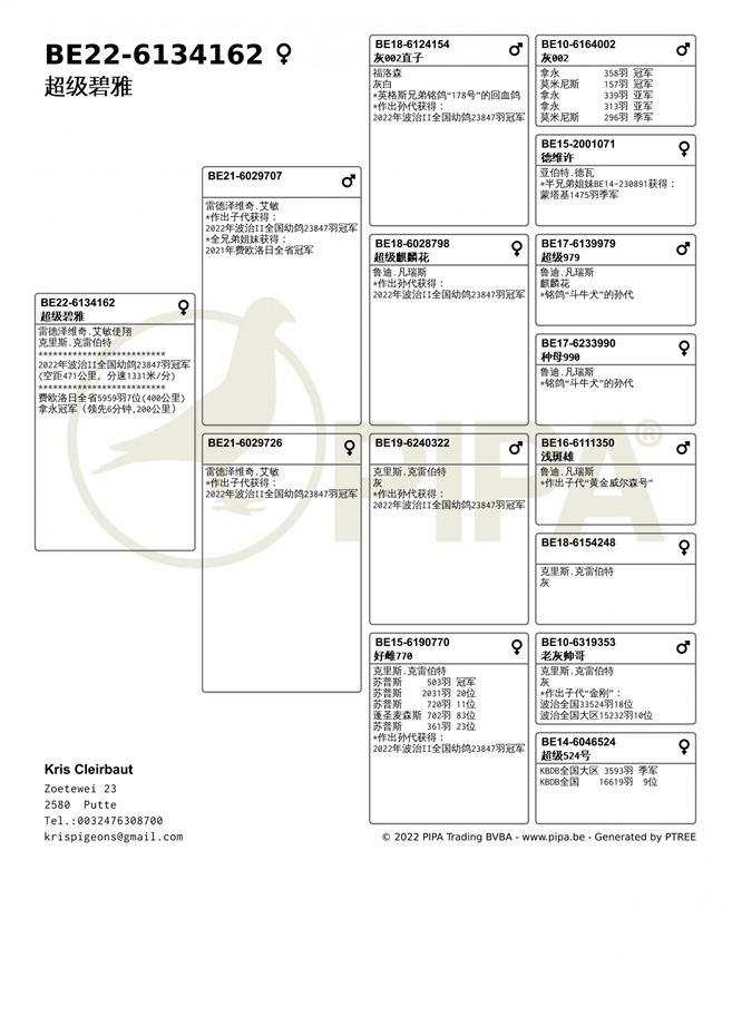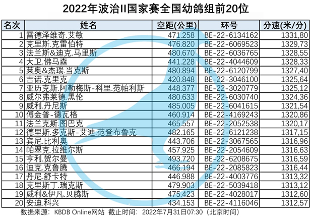 獲得比利時幼鴿全國冠軍-雷德澤維奇.艾敏(Redzovic Emin)鴿舍,該舍冠軍鴿B22-6134162灰母在7月30日 (星期六)下午13時23分完成打鐘,空距為471.258公里,平均分速為1331.8米/分。