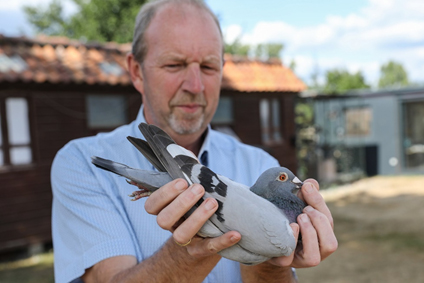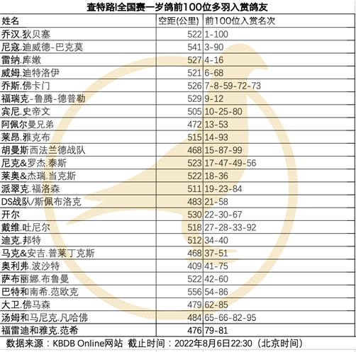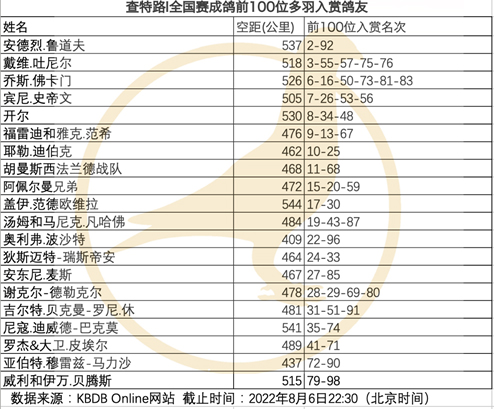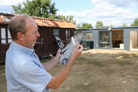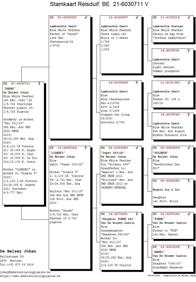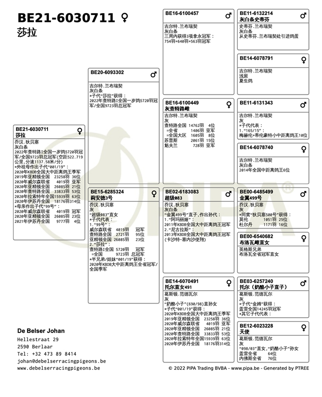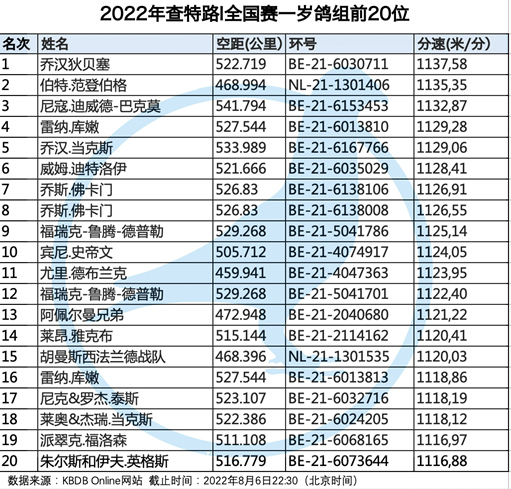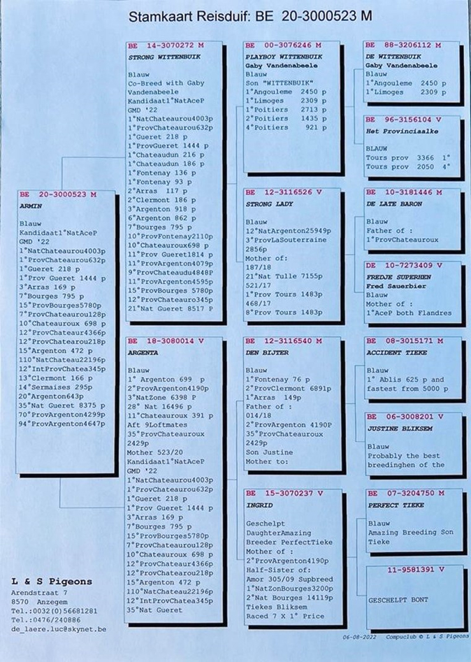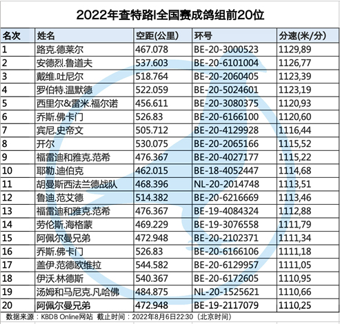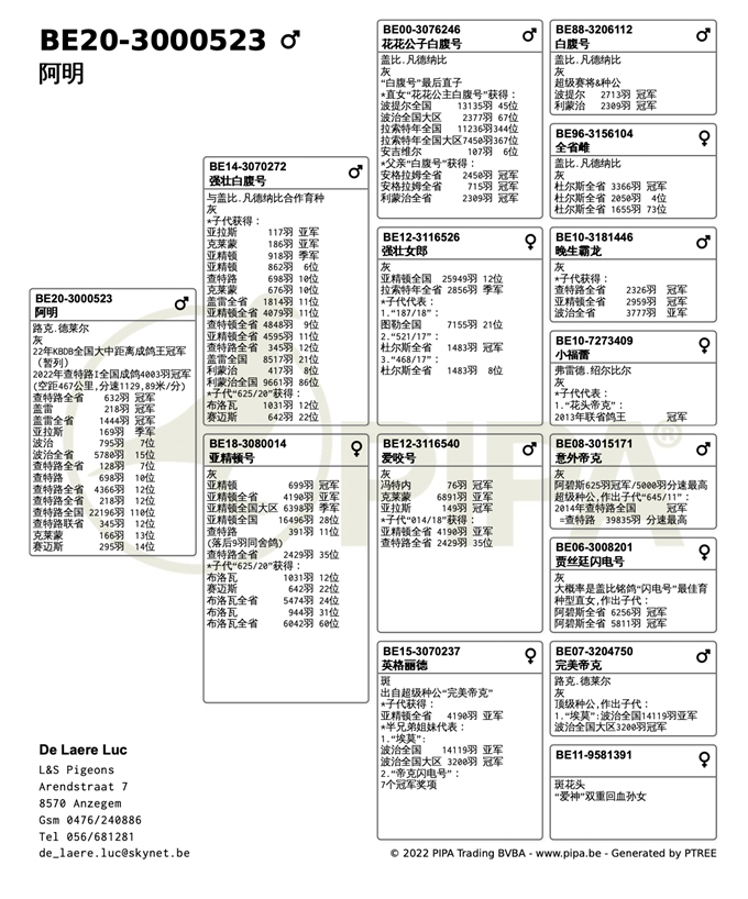 比利時成鴿全國冠軍-路克.德萊爾( De Laere Luc) 鴿舍,該舍冠軍鴿B20-3000523灰公是在8月6日(星期六)下午14時08分完成打鐘,空距為467.078公里,平均分速為1129.89 米/分。