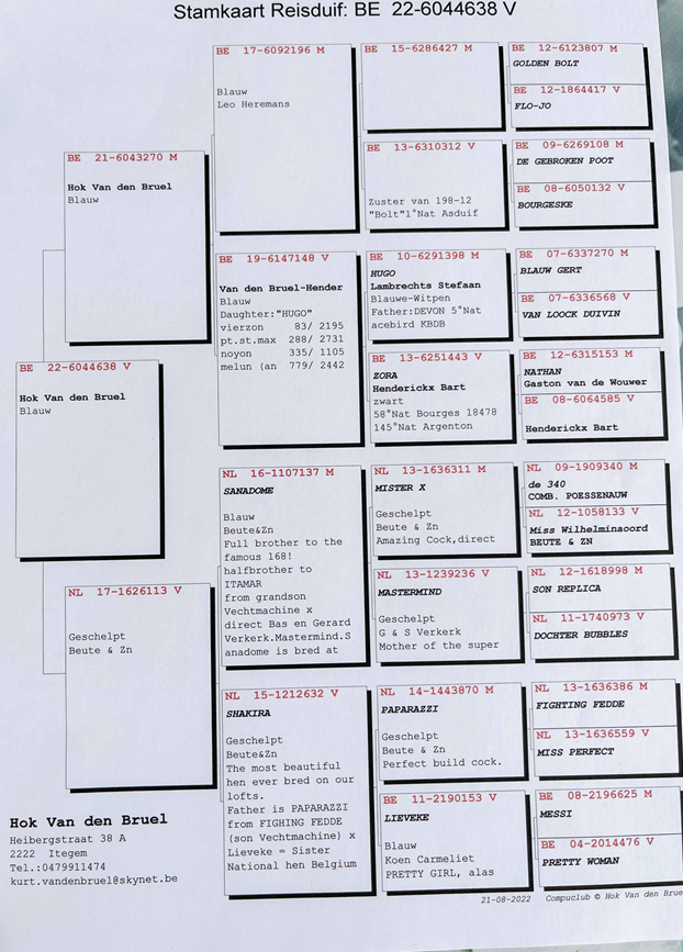 獲得比利時亞精頓 III全國幼鴿組22.865羽冠軍為凡登布魯爾(Hok Van Den Bruel)鴿舍,該舍冠軍鴿B22-6044638灰母是在8月21日(星期日)中午14時22分完成打鐘,空距為550.789公里,平均分速為1441.54米/分,此鴿同時也是交鴿總數28.031羽總冠軍鴿。