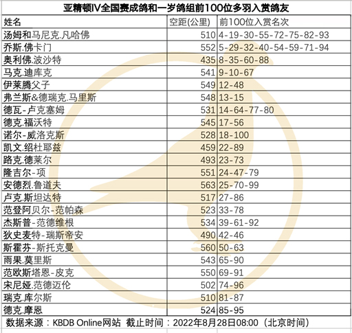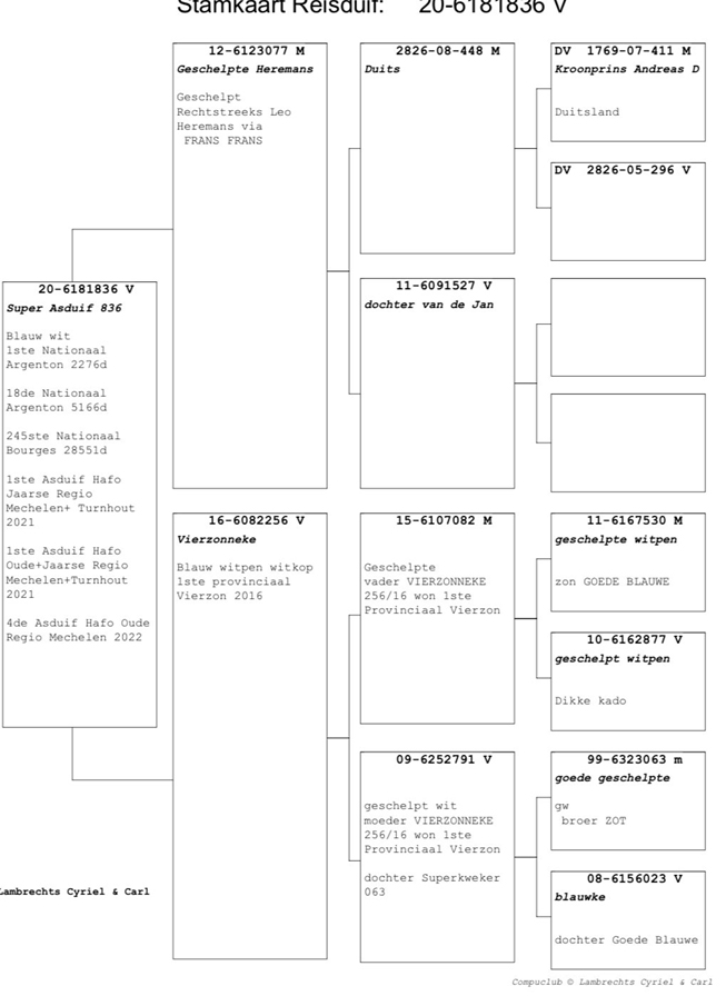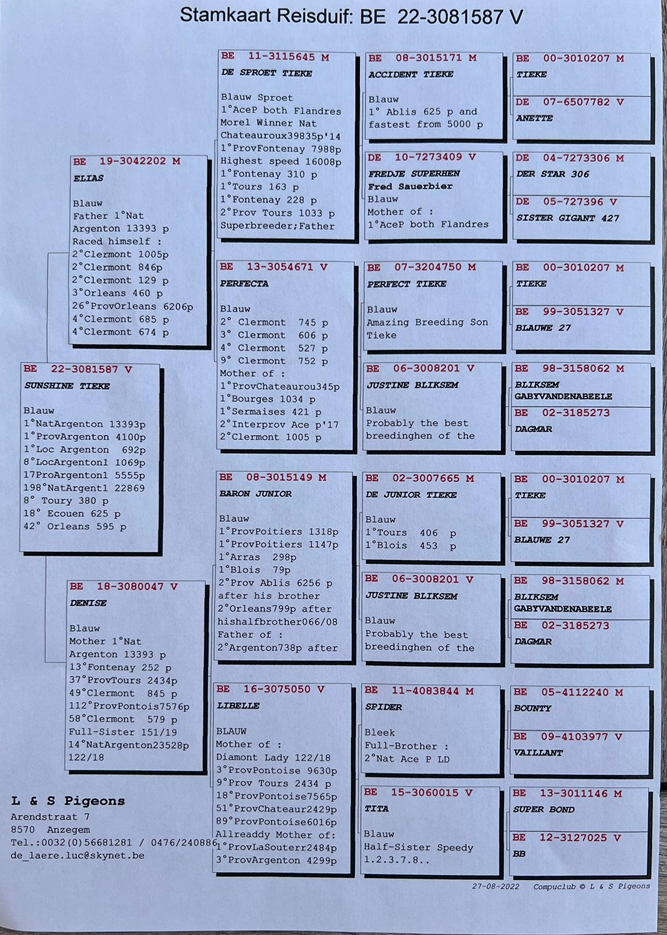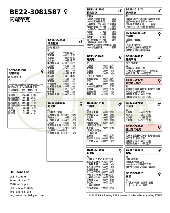 獲得比利時亞精頓 IV全國幼鴿組13.393羽冠軍為路克.德萊爾(De Laere Luc)鴿舍,該舍冠軍鴿B22-3081587灰母是在8月27日(星期六)中午14時53分完成打鐘,空距為493.135公里,平均分速為1191.44米/分,此鴿同時也是交鴿總數15.669羽總冠軍鴿。