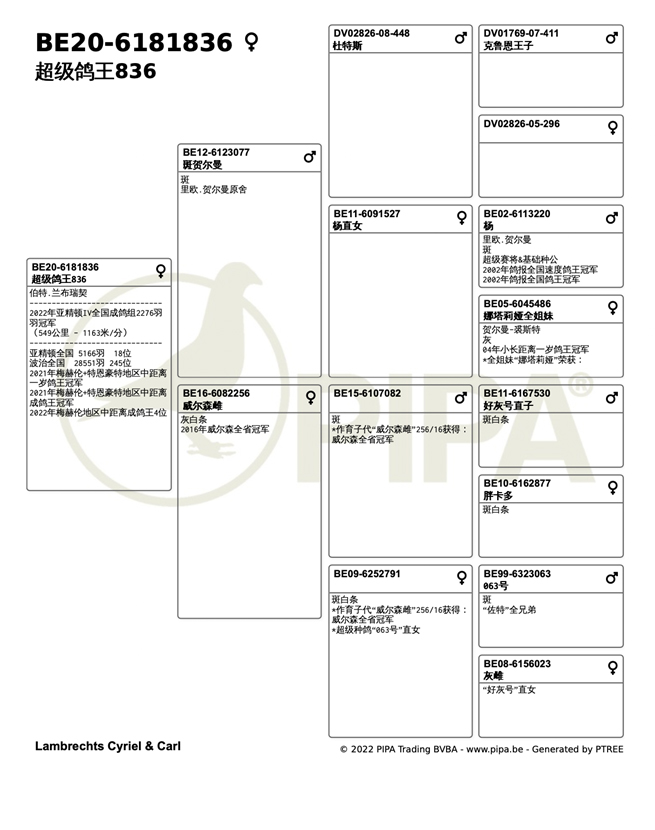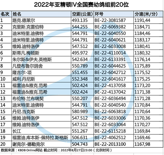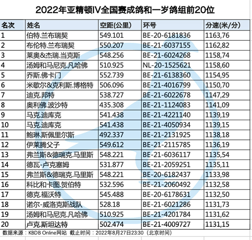比利時亞精頓 IV成鴿2.276羽全國冠軍-伯特.蘭布瑞契( Lambrechts Bert )鴿舍,該舍冠軍鴿B20-6181836灰白羽.母.是在8月27日(星期六)中午15時51分完成打鐘,空距為549.101公里,平均分速為1163.76米/分。