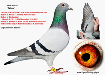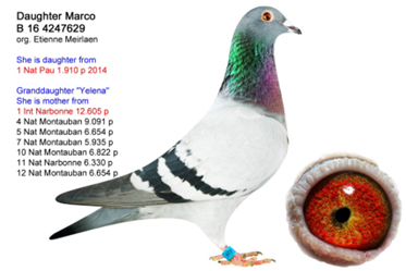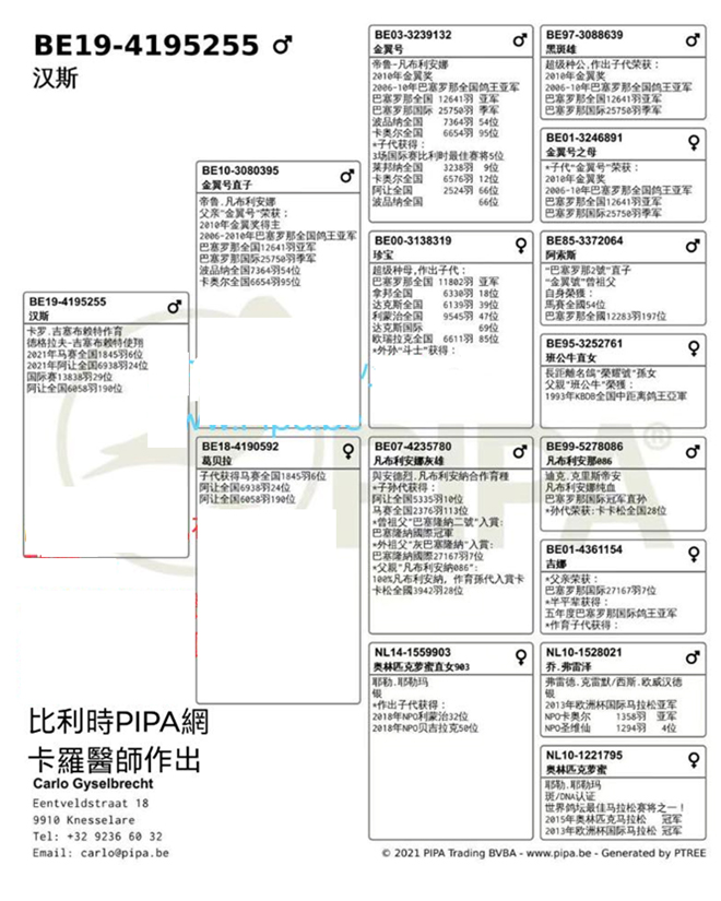 獲得2021年阿讓國際雌鴿7.622羽冠軍“拿邦小姐”(Miss Narbonne BE18-4216097灰母)獲得拿邦全省冠軍和全國一歲鴿季軍。她是黃金種雌“伊蓮娜BE06-4288297灰母”的直孫女。