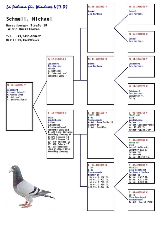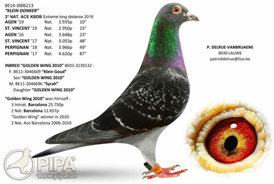 回顧比利時賽鴿運動歷史,有些賽鴿已成為一代傳奇並留下了自己的印記。如果從二戰以後算起的話,或者更為接近現在的視角來說,我們可以列舉出迪沃斯的“小迪迪”(Kleine Didi)、布魯維爾(Bruwier)的 “特立獨行”號(L'exceptionnel)、赫博瑞的“愛克”(Ike)還有佛斯豪特的“阿曼多”。雖然“阿曼多”的關注度更多得以驚人的價格而獲得,但是我們不可忘記他可能是比利時賽鴿運動歷史上最優秀的賽鴿之一,他曾獲得全國賽冠軍-亞軍-亞軍-10位,還有KBDB全國長距離鴿王季軍,他以近乎瘋狂的係數0.2396%取得2018年KBDB全國長距離鴿王冠軍!當時沒有人能預料到這個記錄有朝一日會被打破,但是記錄就是用來被打破的,僅僅3年後,“阿曼多”的創紀錄係數便已成歷史,因為“派翠克”以另外一個瘋狂係數0.196%贏得了全國鴿王頭銜。憑藉如此驚豔的表現,這羽賽鴿絕對配得上躋身比利時賽鴿運動最佳賽鴿行列。同時我們不能忽略作育者派翠克.杜波斯,還有他的主人克利斯蒂安和克瑞爾.哈奇斯,2021年是他們賽鴿生涯的最佳賽季之一,今年他們絕對難以忘懷!