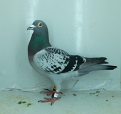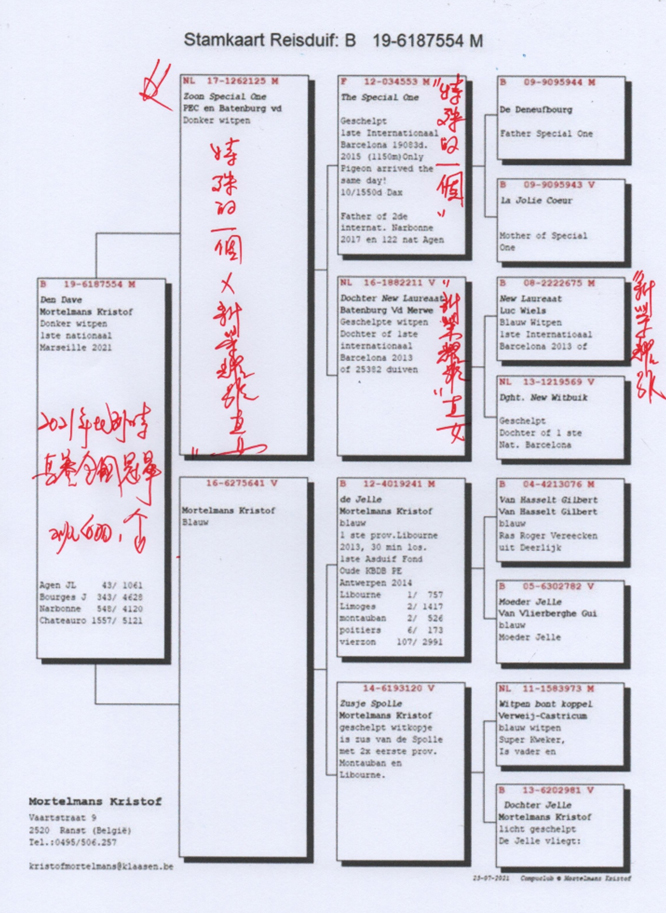 2021年馬賽(Marseille)國際賽10.740羽參與,獲得比利時全國冠軍克裡斯托夫.莫特曼斯(Mortelmans Kristof)鴿舍,該舍冠軍鴿B19-6187554斑白羽.公是在7月22日(星期四)晚上22時06分完成打鐘,空距為881.565公里,平均分速為972.37米/分,未超過1000米/分,全國當日見鴿僅有24羽而已(早上7點放鴿,足足飛翔15個小時,耐力超強)。