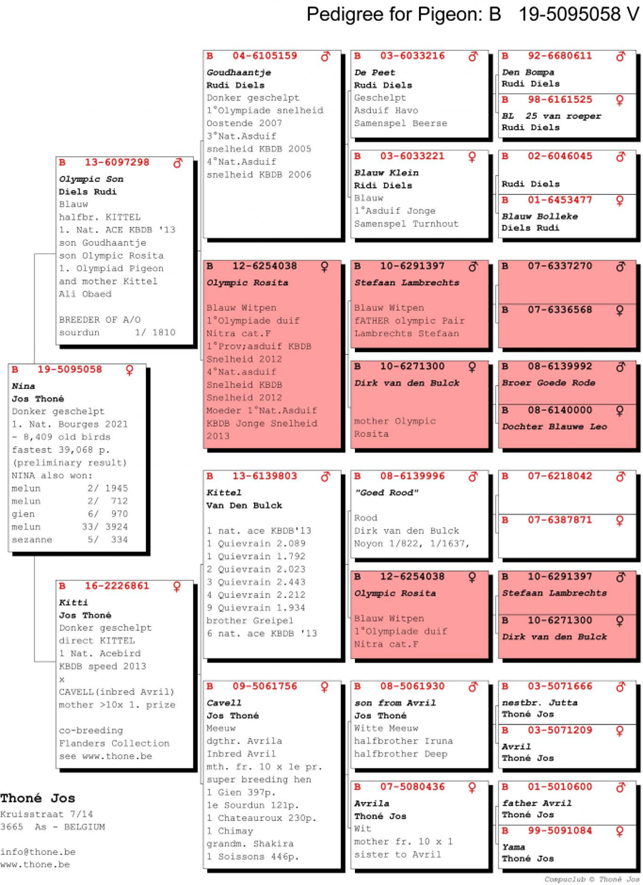 獲得比利時波治II全國賽總交鴿數39.072羽冠軍是老將托內.喬斯(Thone Jos)鴿舍,該舍冠軍鴿B19-5095058斑母(屬成鴿組8.410羽冠軍)是在7月31日(星期六)12時18分,完成打鐘,空距為491.957公里,平均分速為1621.75米/分。