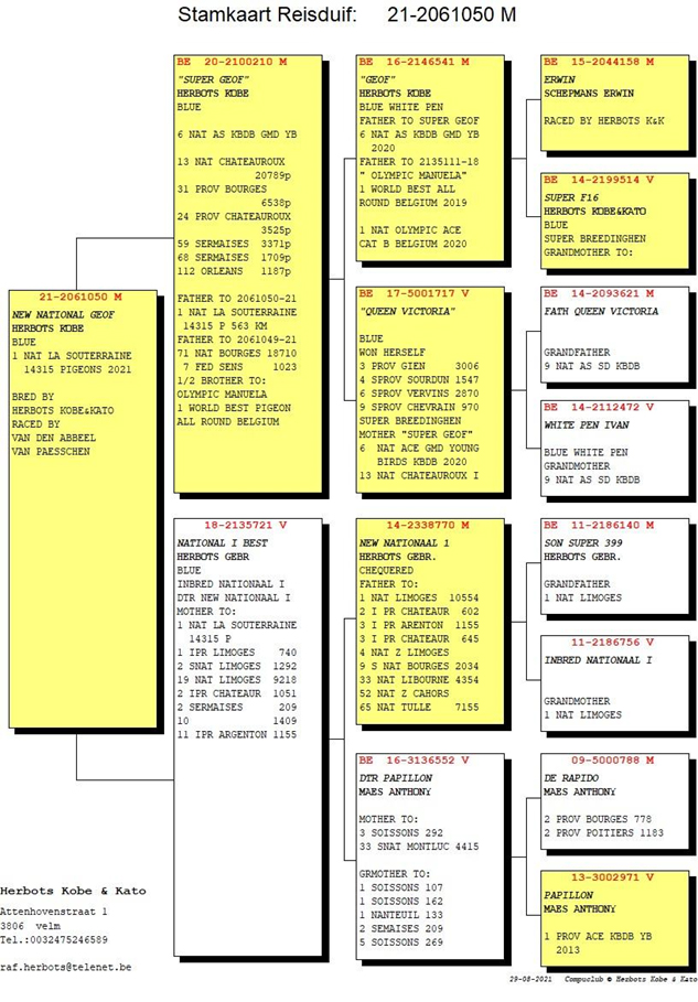 這羽賽鴿何其不凡!如果看過他的成績單,特別是他在3場長距離賽的成績,你肯定要驚歎他的表現。派翠克的名字來自他的作育者:古哈-哈姆克拉(Gaurain-Ramecroix)的派翠克.杜波斯(Patrick Dubois),這羽2歲灰雄鴿已經憑藉他在前兩場比賽利蒙治I和布瑞福的表現成為KBDB全國鴿王的有力競爭者。然後他又獲得利蒙治II全國6986羽冠軍(哈奇斯家族的第3項冠軍)。這也直接終結了關於KBDB全國長距離鴿王冠軍的一切懸念,“派翠克”成為2021年比利時全國最佳長距離賽鴿。
