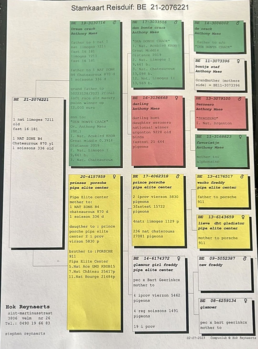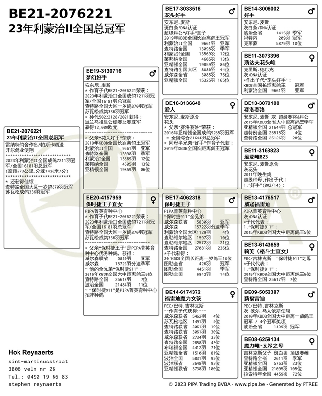 獲得2023年比利時利蒙治II國家賽(約550公里~680公里)成鴿全國7.211羽冠軍是開爾鴿業團隊(Kaier) (Schaffen),該舍冠軍鴿B21-2076221班白羽.公,是在7月2日 ( 星期日)晚上22時37分完成打鐘,空距為673.899公里,平均分速為1426.34米/分。也是總是16.181羽的總冠軍鴿,值得一提的是該舍本次利蒙治II國家賽計獲得冠軍、3位、18位等佳績。