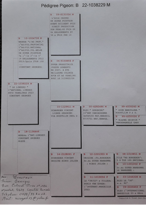 獲得2023年比利時利蒙治II國家賽(約550公里~680公里)一歲鴿全國8.970羽冠軍是喬治.康斯坦特(Constant Georges) (Romsee)鴿舍,該舍冠軍鴿B22-2138229斑白羽.公是在7月3日(星期一)凌晨3時47分完成打鐘,空距為652.895公里,平均分速為1425.02 米/分。