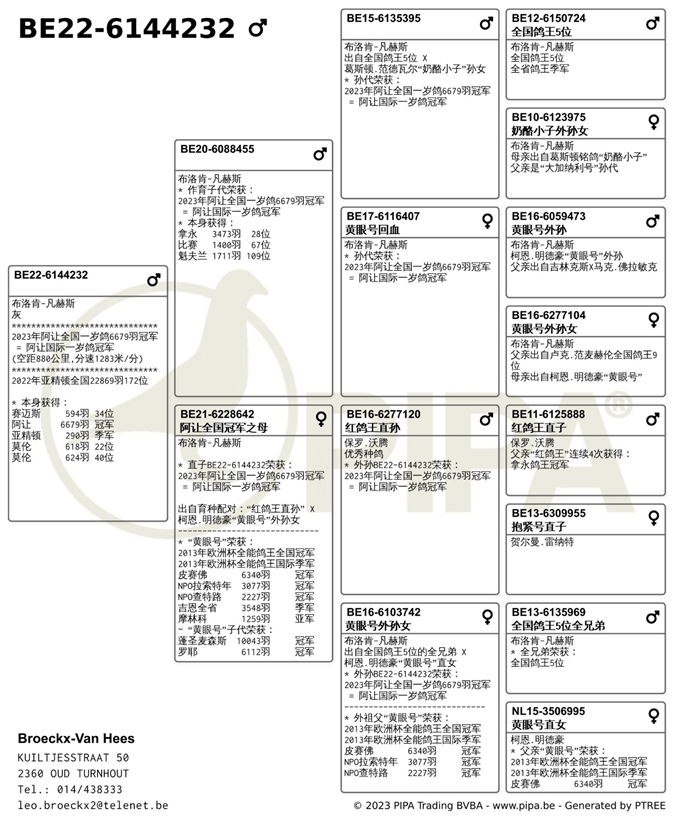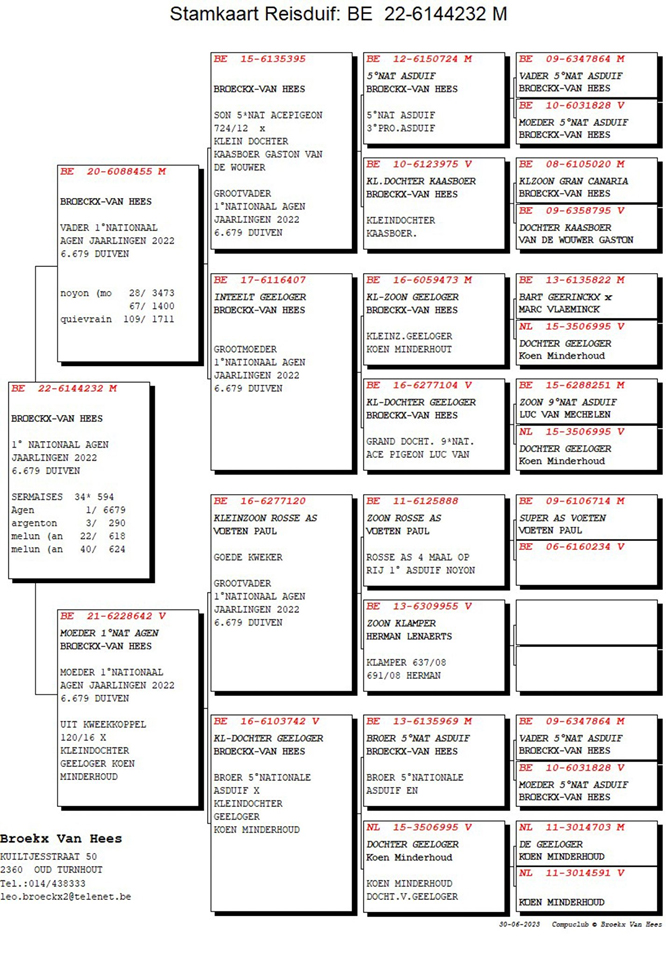 2023年阿讓(國際賽) 比利時一歲鴿6.679羽冠軍,也是國際一歲鴿冠軍是布洛肯-凡赫斯(Broeckx-Van Hees) (Oud-Turnhout)鴿舍,該舍冠軍鴿B22-6144232灰公是在7月1日(星期六)凌晨1時41分,完成打鐘,空距為880.766公里,平均分速為1283.54 米/分。