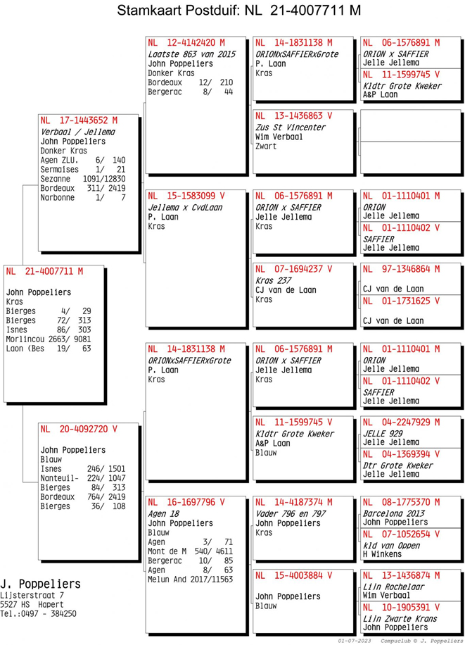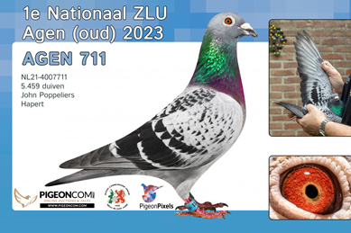 2023年荷蘭阿讓(國際賽) "成鴿組5.459羽" 全國冠軍是約翰.波佩利埃(Poppeliers John ) (Hapert).鴿舍,該舍冠軍鴿NL21-4007711班公是在7月1日(星期六)凌晨1時51分完成打鐘,空距為890.207公里,平均分速為1277.35 米/分。