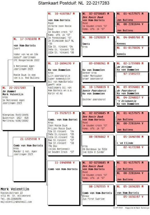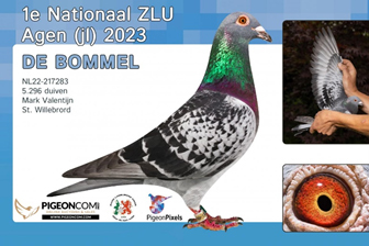 荷蘭阿讓(國際賽) "一歲鴿5.296羽"全國冠軍-是馬克.瓦倫汀(Valentijn Mark) (St. Willebrord).鴿舍,該舍冠軍鴿NL22-2217283班公是在7月1日(星期六)凌晨2時0分完成打鐘,空距為892.715公里,平均分速為1266.2米/分。