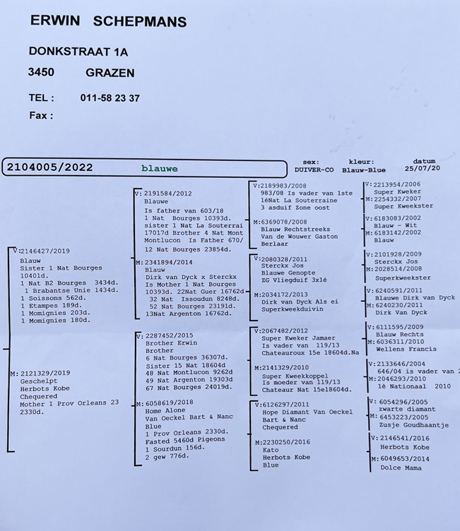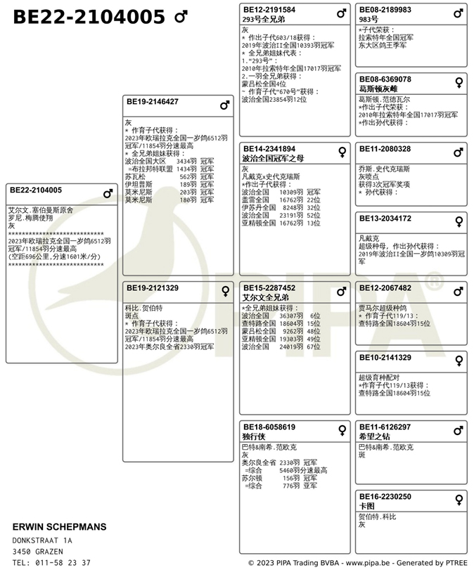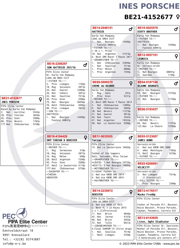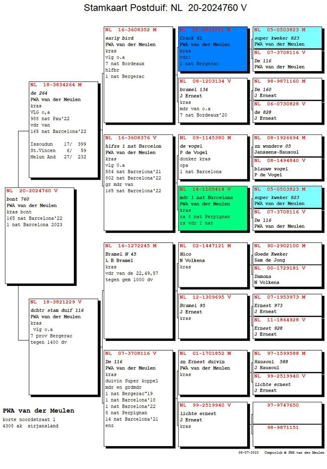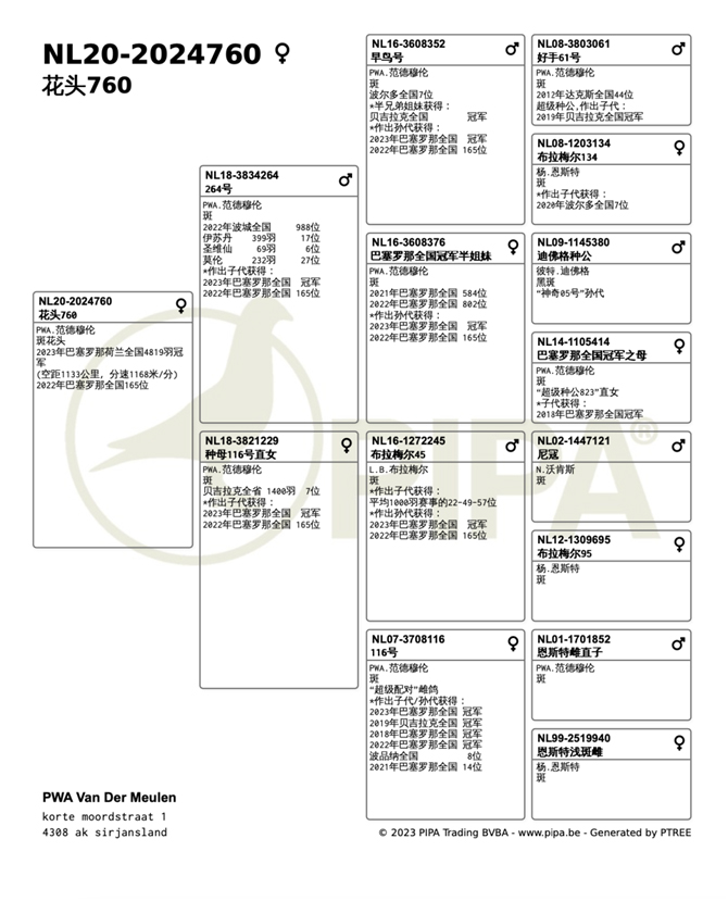 2023年荷蘭巴塞羅那(國際賽) "成鴿4.819羽"全國冠軍是范德穆倫(PWA v/d Meulen) (Sirjansland)鴿舍,該舍冠軍鴿NL20-2024760班白羽.母,是在7月8日(星期六)凌晨5時21分完成打鐘,空距為1133.19公里,平均分速為1168.38 米/分。