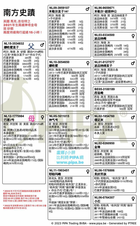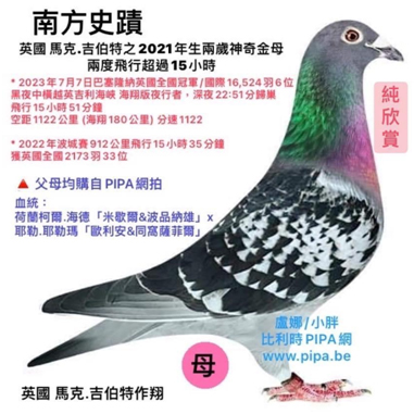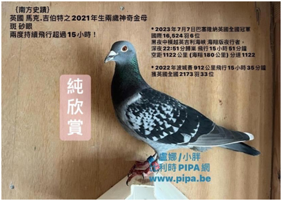 2023年英國巴塞羅那(國際賽) "成鴿308羽"全國冠軍是馬克.吉伯特 (Gilbert Mark)鴿舍,該舍冠軍鴿GB21-斑母是在7月7日(星期五)晚上22時51分完成打鐘,空距為1122.66公里,平均分速為1179.94 米/分。