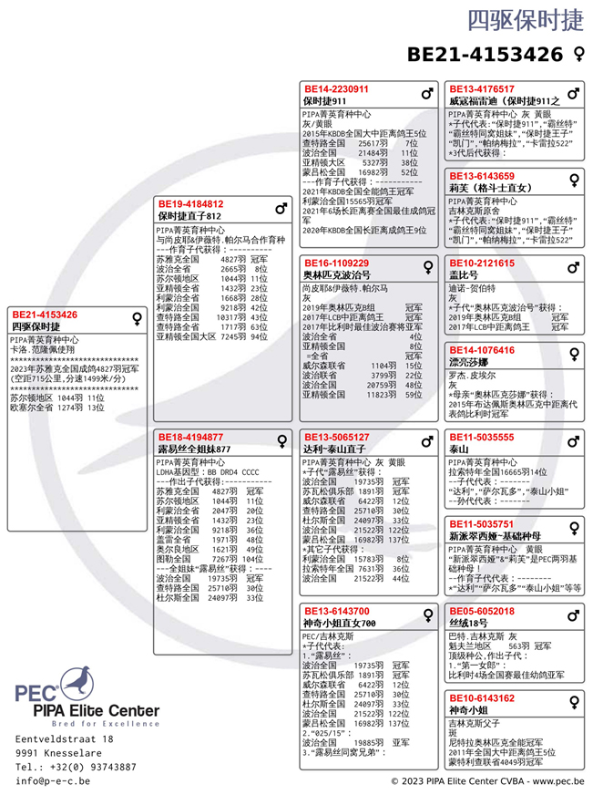 其實這回卡洛.範隆佩(Van Rompaey Karlo)鴿舍超強表現,除"一歲鴿6.085羽"全國冠、亞軍外,”成鴿組4.827羽”也獲得冠軍。冠軍鴿B21-4153426灰母是14時52分24秒完成打鐘,空距為715.821公里,平均分速為1499.78米/分。