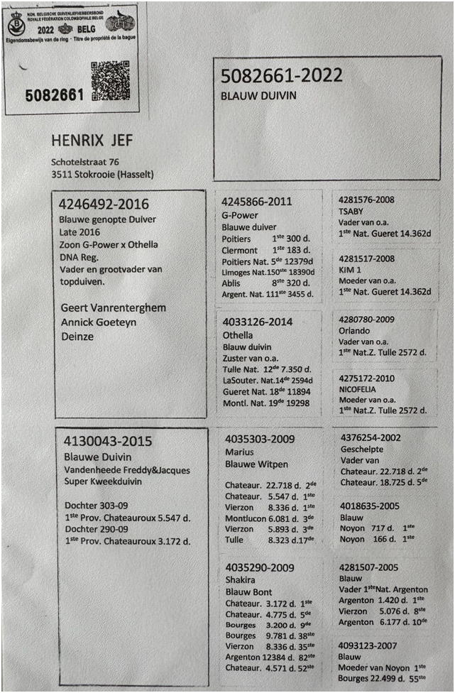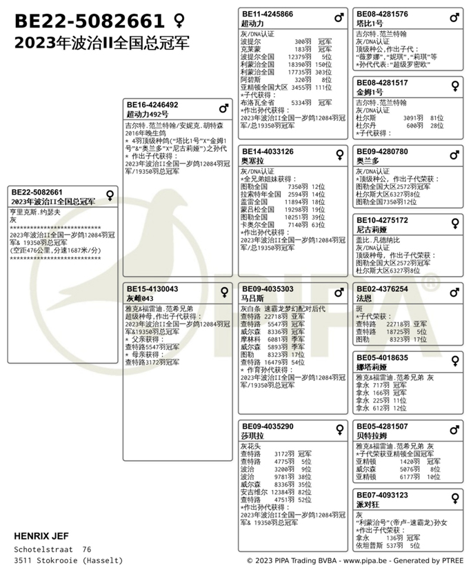 獲得比利時波治II全國賽交鴿總數19.350羽總冠軍是亨里克斯.約瑟夫(Henrix Jozef)鴿舍,該舍冠軍鴿B22-5082661灰母,是在7月30日(星期日)中午13時2分完成打鐘,空距為476.8公里,平均分速為1687.39米/分,獲得全國一歲鴿12.084羽冠軍,更是比利時波治II全國集鴿總數19.350羽總冠軍鴿。