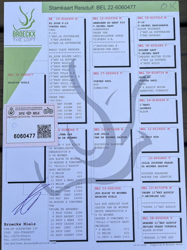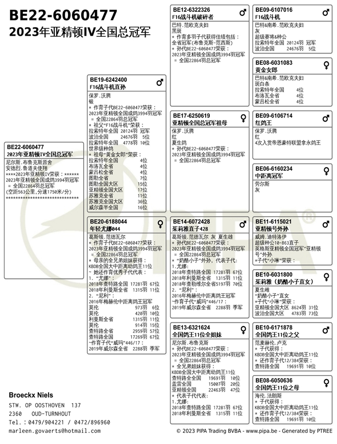 獲得2023年比利時亞精頓 IV全國成鴿組3.994羽冠軍為安德烈.魯道夫(Roodhooft Andre)鴿舍,