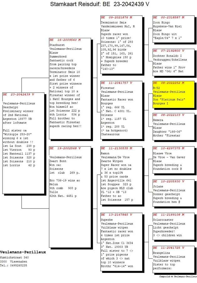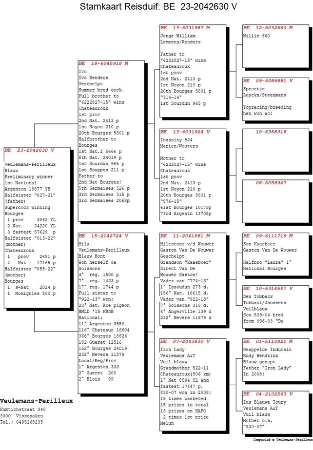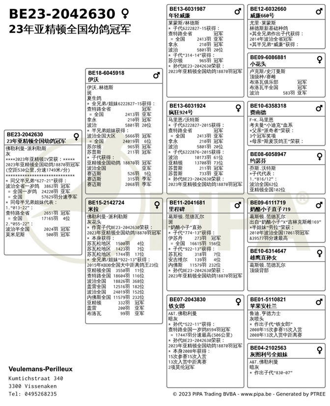 獲得2023年比利時亞精頓 IV全國幼鴿組18.870羽冠軍為佛勒利曼-派利勒斯(Veulemans-Perilleux)鴿舍,該舍有兩羽鴿一起抵達,分別入賞幼鴿組冠、亞軍。