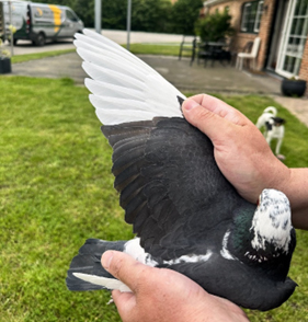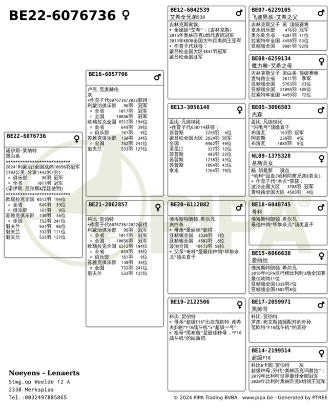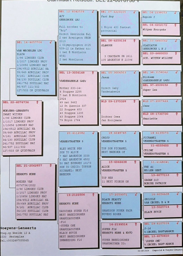 獲得2024年比利時利蒙治I國家賽(約550公里~680公里)成鴿10.657羽全國冠軍是?伊斯.尼?斯&昆廷(Noeyens Niels & Quinten)團隊,冠軍鴿B22-6076736黑白羽.母是在6月4日(星期二)下午 16時36分完成打鐘,空距為701.817公里,,平均分速為1442.39 米/分。