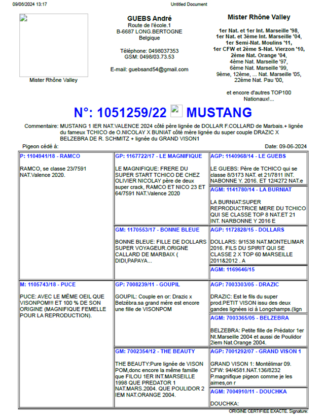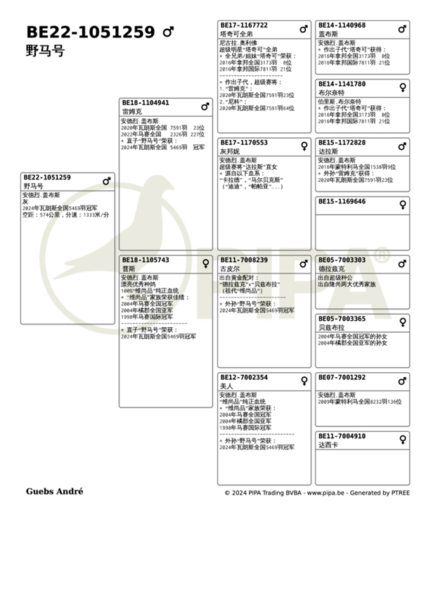 2024年比利時瓦朗斯國家賽"成鴿組"5.469羽全國冠軍是安德列.蓋布斯 (Guebs Andre) 鴿舍,該舍冠軍鴿B22-1051259灰公是在6月8日(星期六)下午14時30分完成打鐘,空距為574.207公里,平均分速為1333.35米/分。