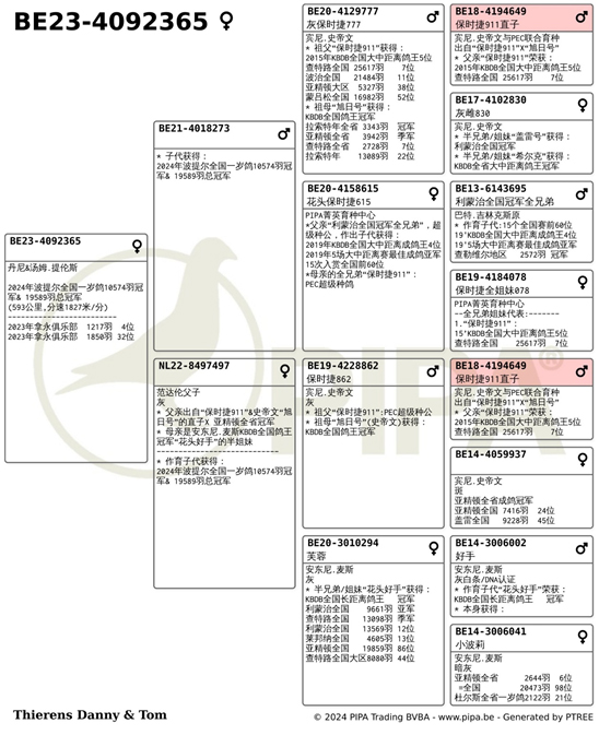 2024年比利時波提爾國家賽"一歲鴿"10.574羽全國冠軍是丹尼&湯姆.提倫斯(Thierens Danny & Tom).鴿舍,該舍冠軍鴿B23-4092365灰母是在6月15日(星期六)中午12時44分,完成打鐘,空距為593.088公里,平均分速為1827.89米/分。同時也是這次提爾國家賽集鴿總數19,589羽總冠軍鴿。