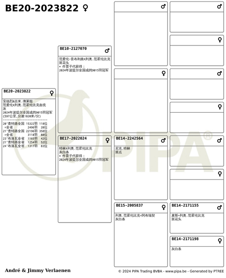 2024年比利時波提爾"成鴿9.015羽"全國冠軍 - 是安德列&吉米.佛萊能( Verlaenen Andre & Jimmy )鴿舍,該舍冠軍鴿B22-2023822灰母是在6月15日(星期六)中午 12時48分完成打鐘,空距為597.396公里,,平均分速為1820.22 米/分。