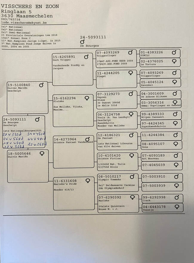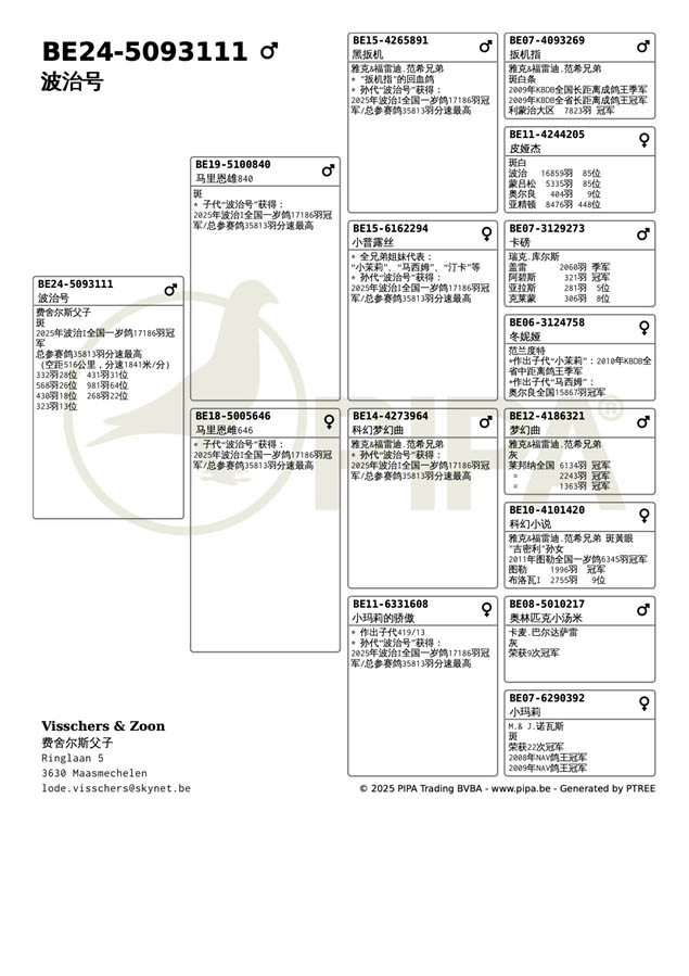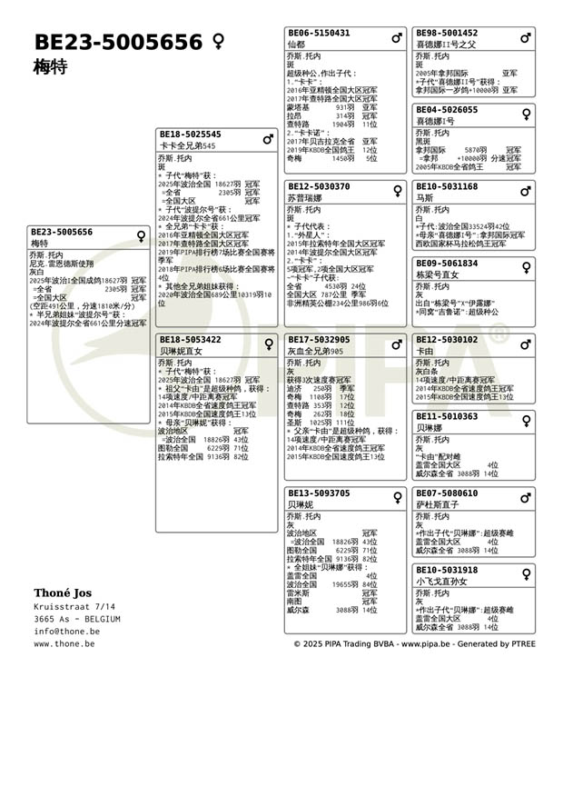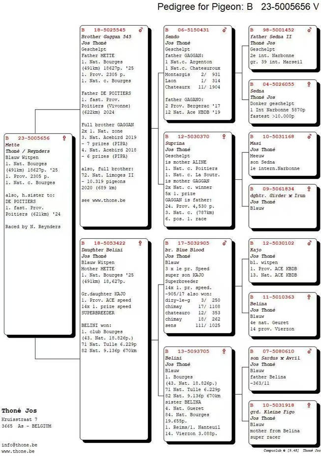 獲得2025年比利時波治I "成鴿18.627羽" 全國冠軍是雷恩德斯.尼克(Reynders Nico )鴿舍,該舍冠軍鴿B23-5005656灰母是在5月24日(星期六)下午11時36分,完成打鐘,空距為490.889公里,平均分速為1810.06米/分。
