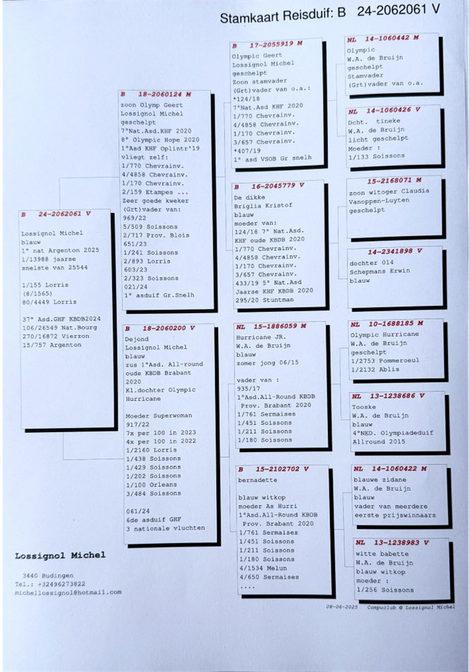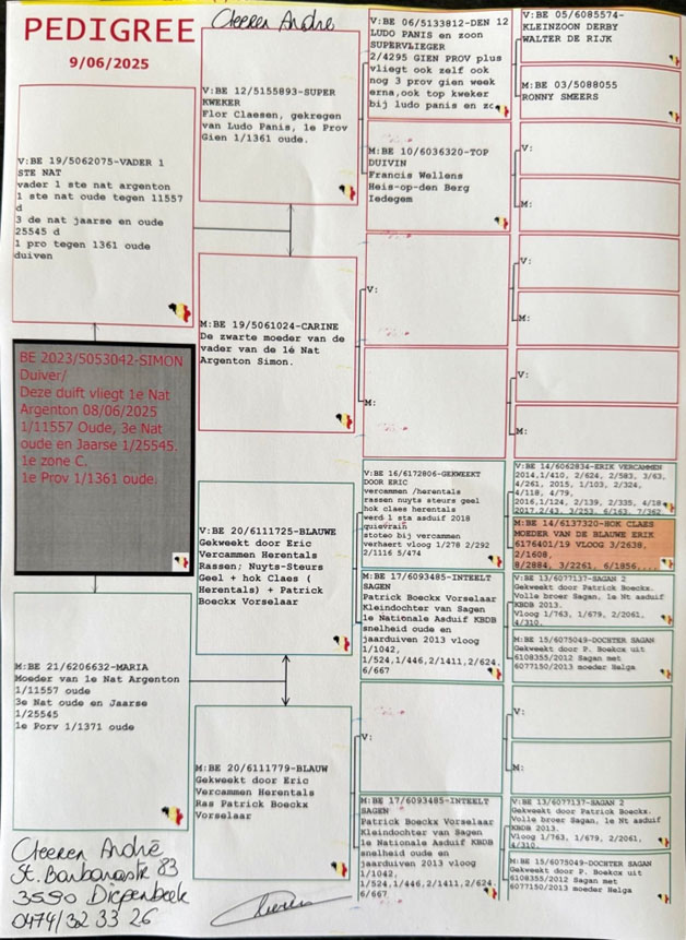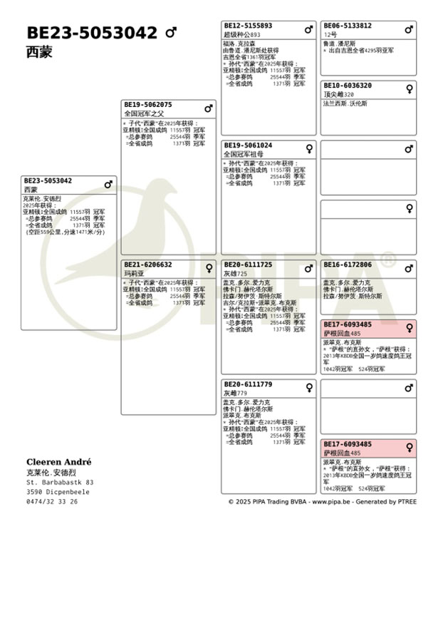 獲得2025年比利時亞精頓I國家賽”成鴿組”11.556羽冠軍為克萊倫.安德列(Cleeren Andre)鴿舍,該舍冠軍鴿B23-5053042班公.於6月8日(星期日)下午15時49分完成打鐘,空距為558.715公里,,平均分速為1471.53米/分。