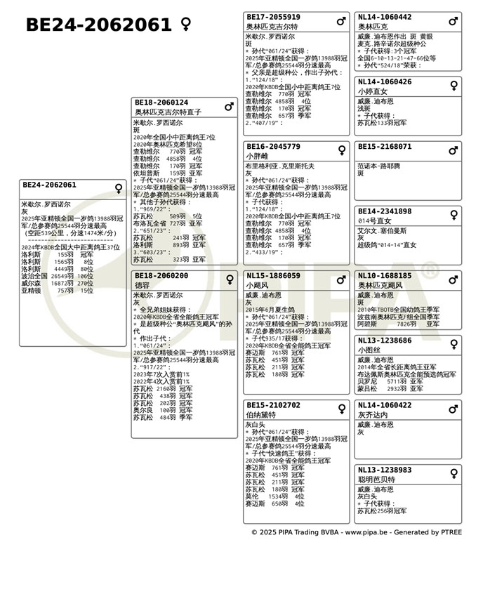 獲得2025年比利時亞精頓I國家賽”一歲鴿”13.988羽冠軍為蜜雪兒.羅西諾爾(Lossignol Michel)鴿舍,該舍冠軍鴿B24-2062061灰.母.於6月8日(星期日)下午15時35分完成打鐘,空距為539.002公里,,平均分速為1474.7米/分。也是亞精頓I國家賽集鴿總數25.544羽總冠軍鴿。
