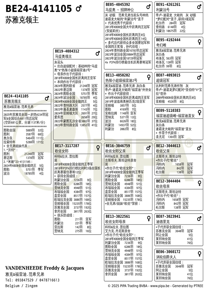獲得比利時2023年蘇雅克"一歲鴿4.234羽"全國冠軍是雅克&福雷迪.范希兄弟(Vandenheede Jacques & Freddy)鴿舍,該舍冠軍鴿B24-4141105班公是在7月12日(星期六)下午16時44分完成打鐘,空距為681.967公里,平均分速為1137.21 公尺/分,同時也是集鴿總數8.811羽總冠軍鴿。