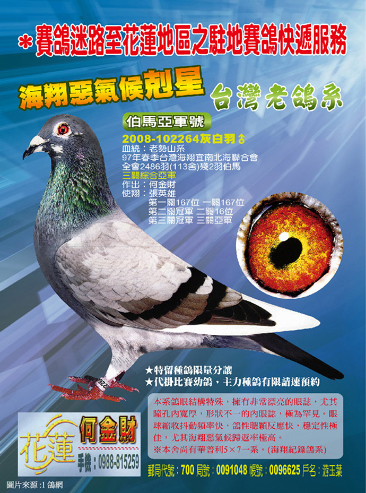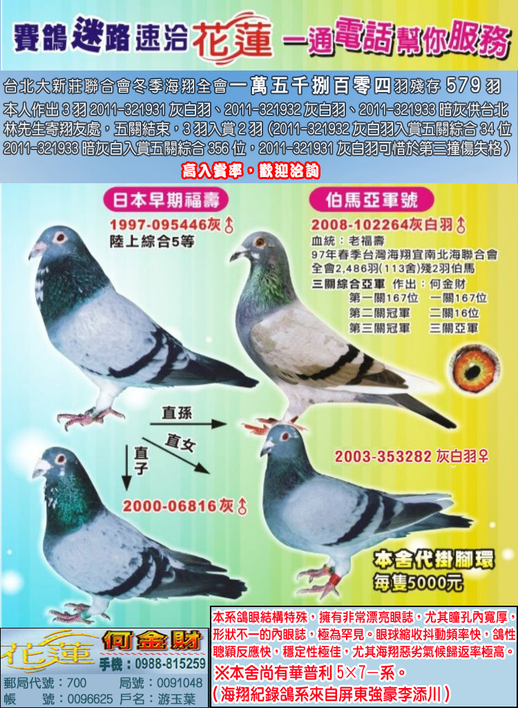 入賞同輩鴿每羽特價$1萬元 電話:0988-815259