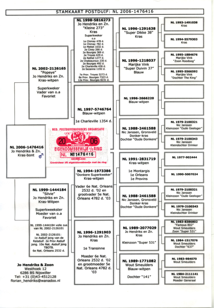 “超級種鴿273”作出直仔速度特快,計入賞3次冠軍、8次亞軍等,血源來自荷蘭女強豪瑪莉亞.芬克鴿系(屬考布曼鴿系) |