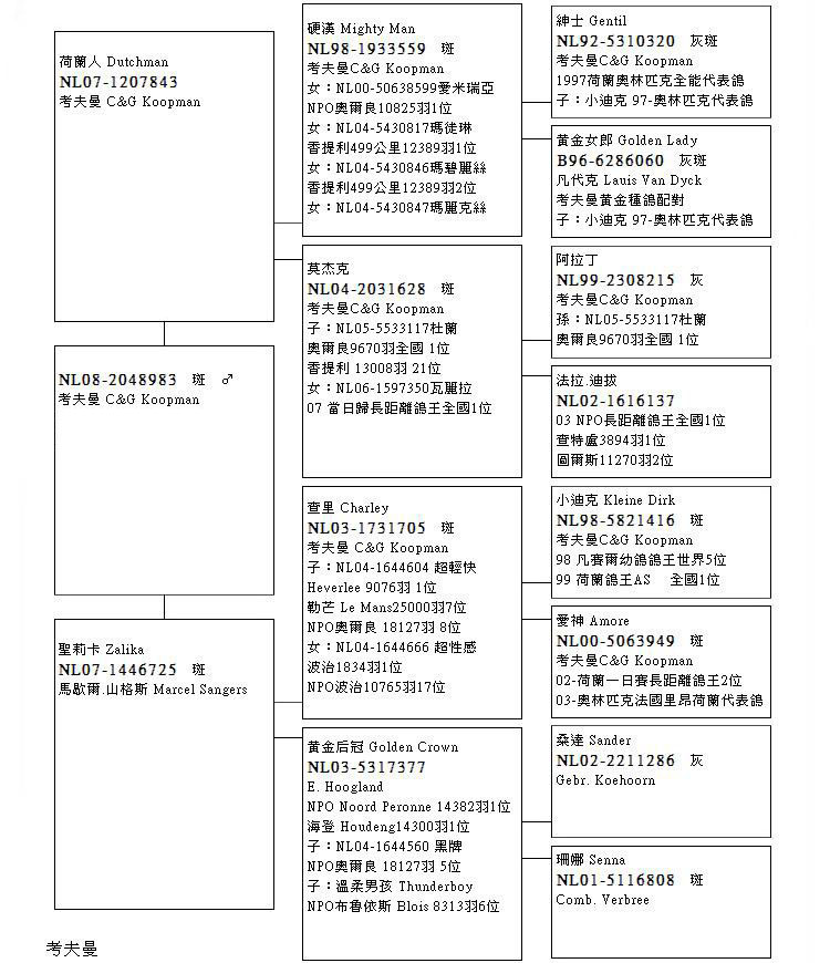 小迪克(Kleine Dirk)世界知名銘鴿1999Vredesduif鴿報全國鴿王1位1999 NPO特洛伊(529公里)全國17.884羽冠軍1999 NPO波治(700公里)全國7.165羽冠軍 |
