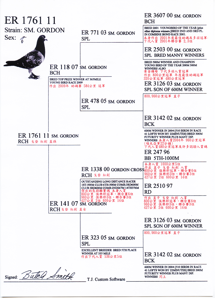 本身入賞2004年960公里冠軍(領先亞軍22分)下代入賞480公里冠軍及多羽認證入賞 |