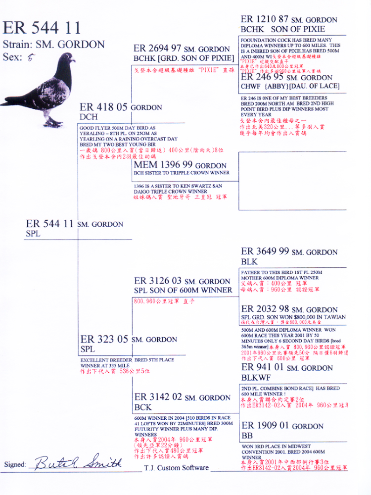 孫代在台灣入賞獎金800,000元美金 本身入賞800/960公里認證冠軍 2001年960公里領先50分 隔日僅6羽歸返作出下代入賞600公里冠軍 |