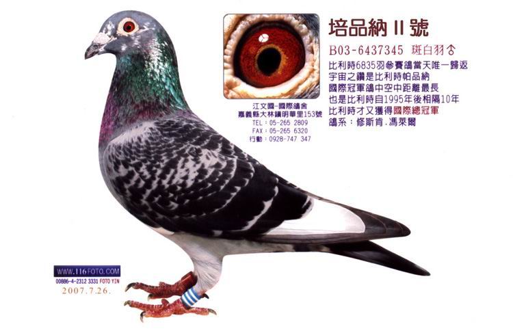 全兄弟”宇宙之鑽”B03-6437345榮獲2006年波品納國際14.812羽冠軍(比利時6.835羽參賽鴿當天唯一歸返970km)。