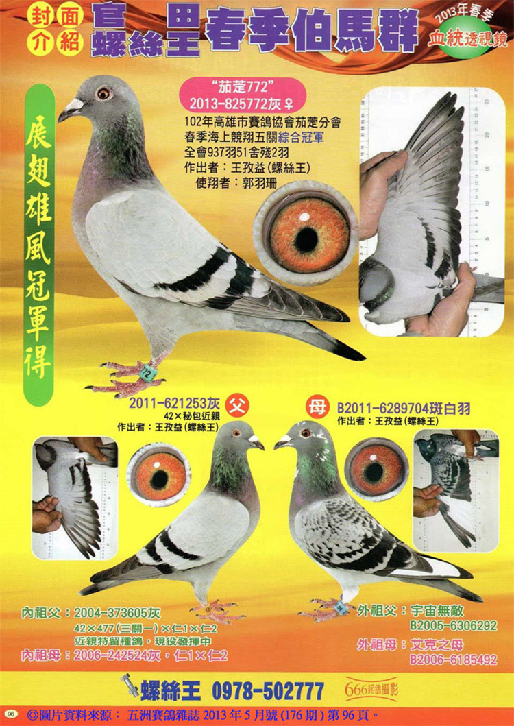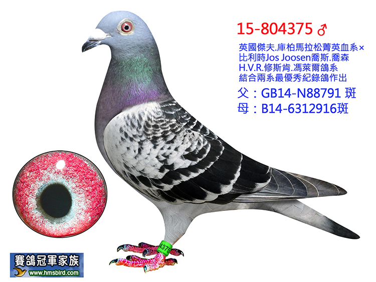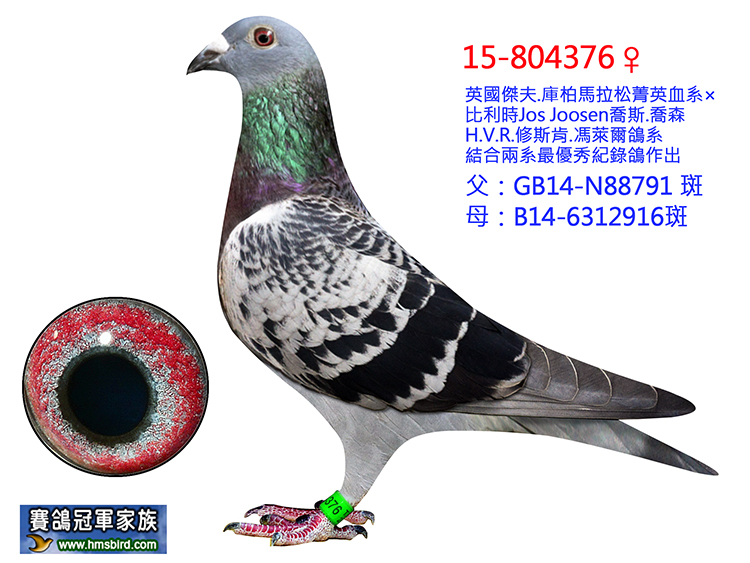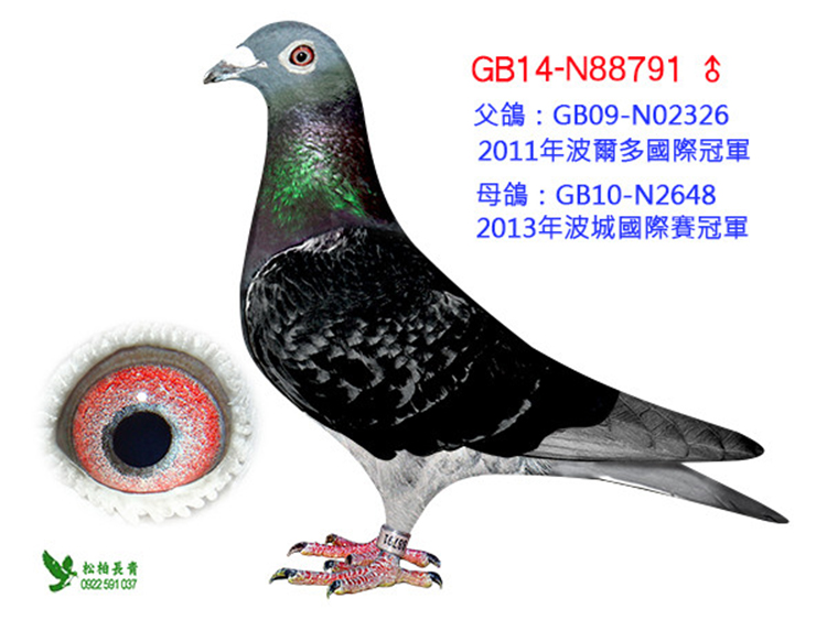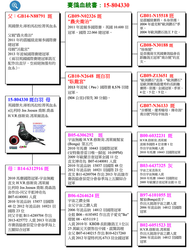 父親"農夫喬治"是2011年的震撼級波爾多國際冠軍得主! 母親"沃龍宮",2013年波城國際賽冠軍得主! 英國庫柏夫婦馬拉松菁英血系的精彩呈現! 祖父:GB09-N02326 “喬治農夫” ,黑斑,神奇的國際波爾多22.066羽總冠軍鴿 曾祖父:GB01N15518班公,"農場男孩" 是震撼級賽將,也是頂級種公 祖母鴿:GB10-N2648,"臥龍宮",2013年波城國際賽冠軍得主 母鴿:B14-6312916宇宙無敵直女 母鴿:B14-6312916原文血統書 外祖父:B05-6306292 於2010年馬賽 10443羽國際冠軍 母親同父半姊 B11-6289704 (作出2013-825772 灰 母入賞102年茄萣會春季五關綜合冠軍)