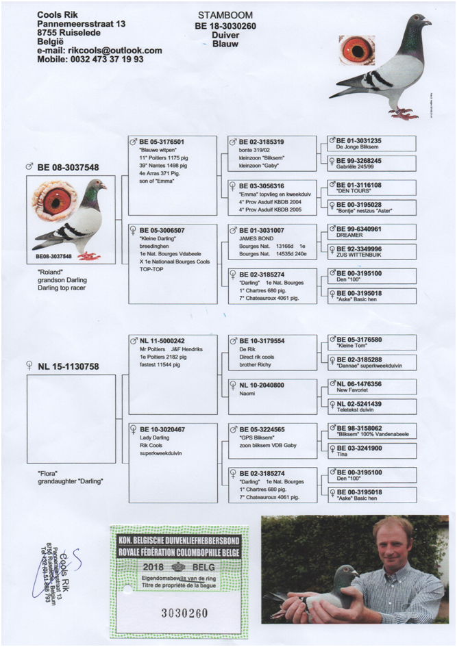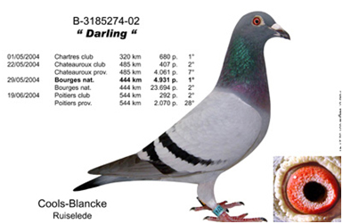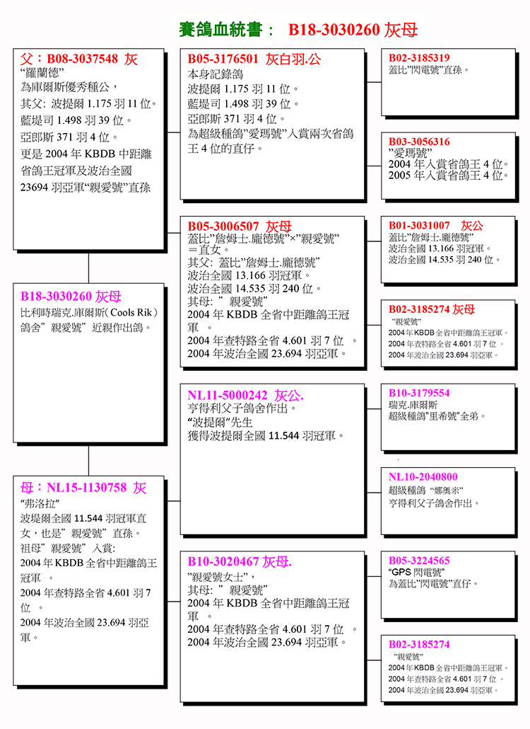 ●父鴿:B08-3037548灰,”羅蘭德”是庫爾斯優秀種公,更是2004年KBDB中距離省鴿王冠軍及波治全國23694羽亞軍”親愛號”直孫。
