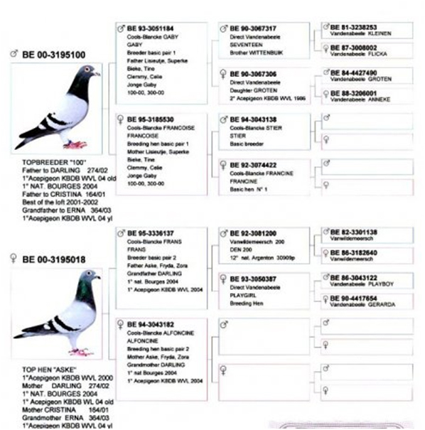 父鴿:B00-3195100灰公,“100號”灰,蓋比白腹號兄弟直孫,蓋比.凡德納比。