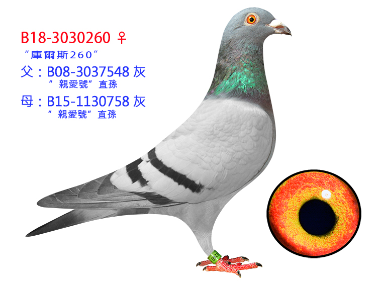 母鴿:B00-3195018.“雌鴿王”灰,瑞克•庫爾斯傑出種鴿 。