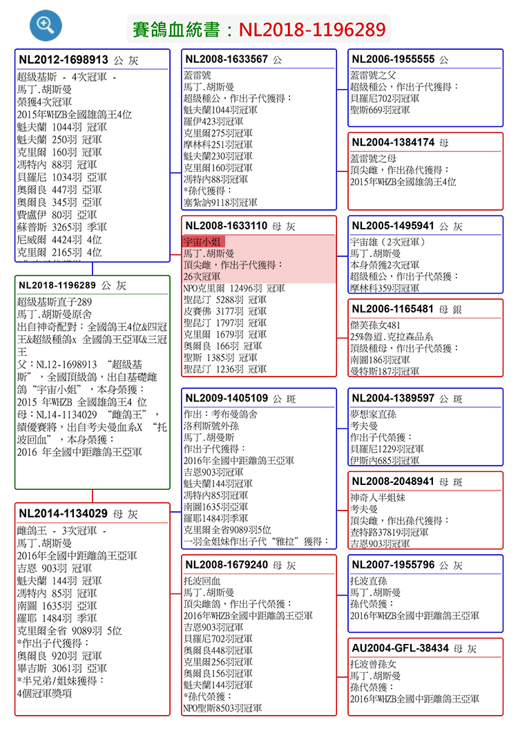 ●父:NL12-1698913 “超級基斯”,全國頂級鴿,出自基礎雌鴿“宇宙小姐”,本身榮獲: