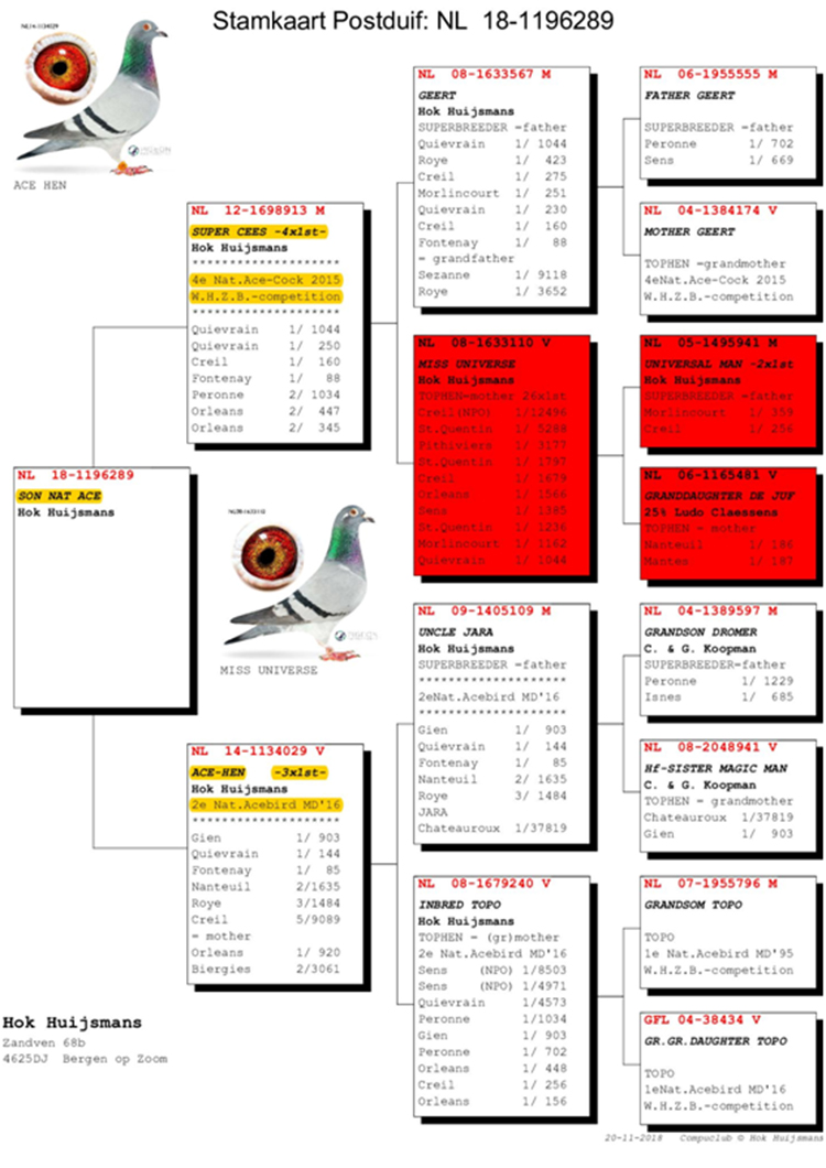 母:NL14-1134029 “雌鴿王”,績優賽將,出自考夫曼血系X “托波回血”,本身榮獲: